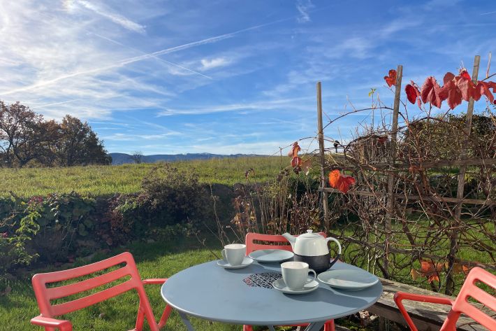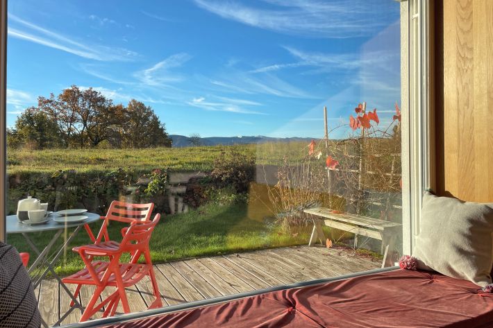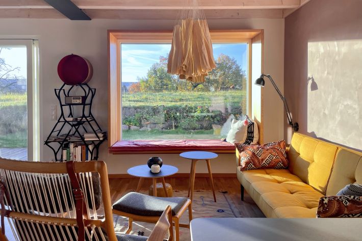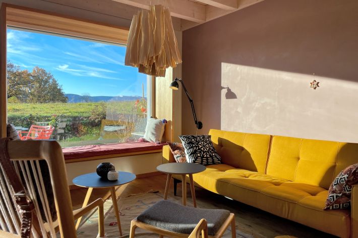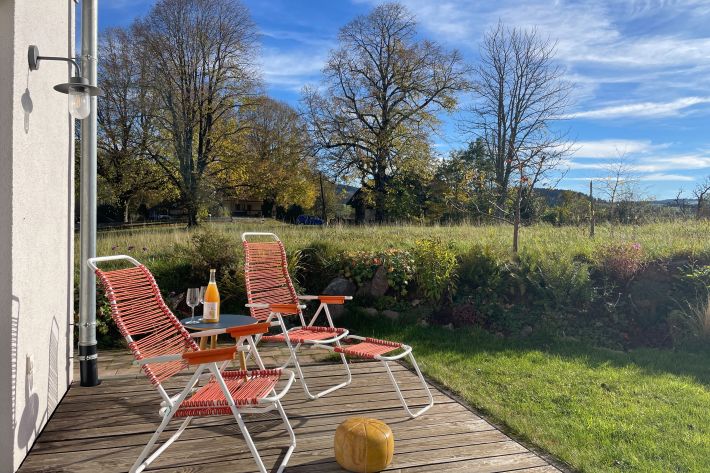 Die hochwertig ausgestattete Ferienwohnung liegt in einem 2020 nach bauökologischen Richtlinien fertiggestellten Haus. Sie verfügt über einen eigenen Eingang, eine Sonnenterrasse und ein großes Sitzfenster mit wunderbarem Blick auf das Feldberg-Massiv mitten im Naturpark Südschwarzwald.