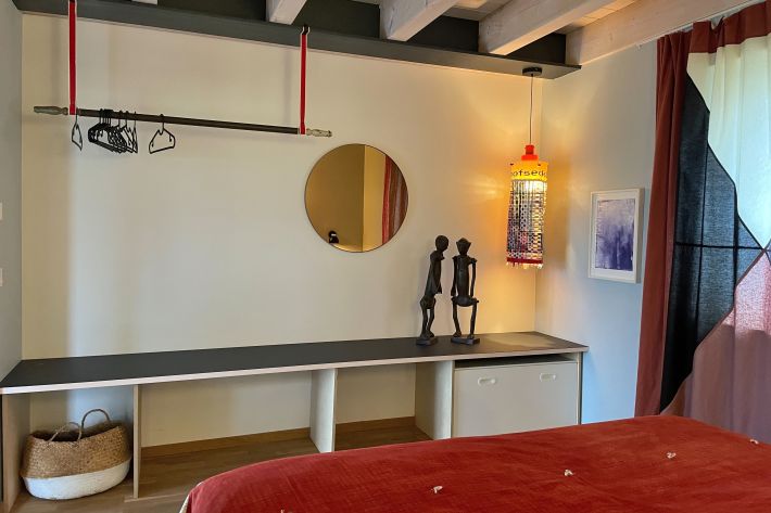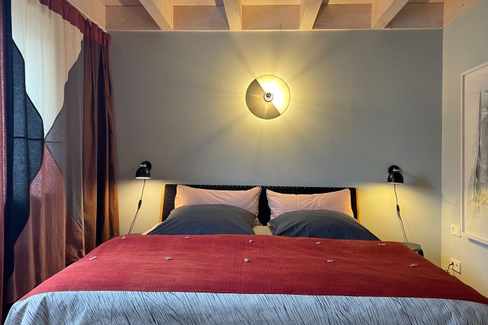 - Schlafzimmer mit Garderobe und Doppelbett (hochwertige Coco-Mat-Matratzen aus Naturmaterialien), bezogene Betten. Bei Bedarf kann ein Beistellbett und ein Babybett bereitgestellt werden