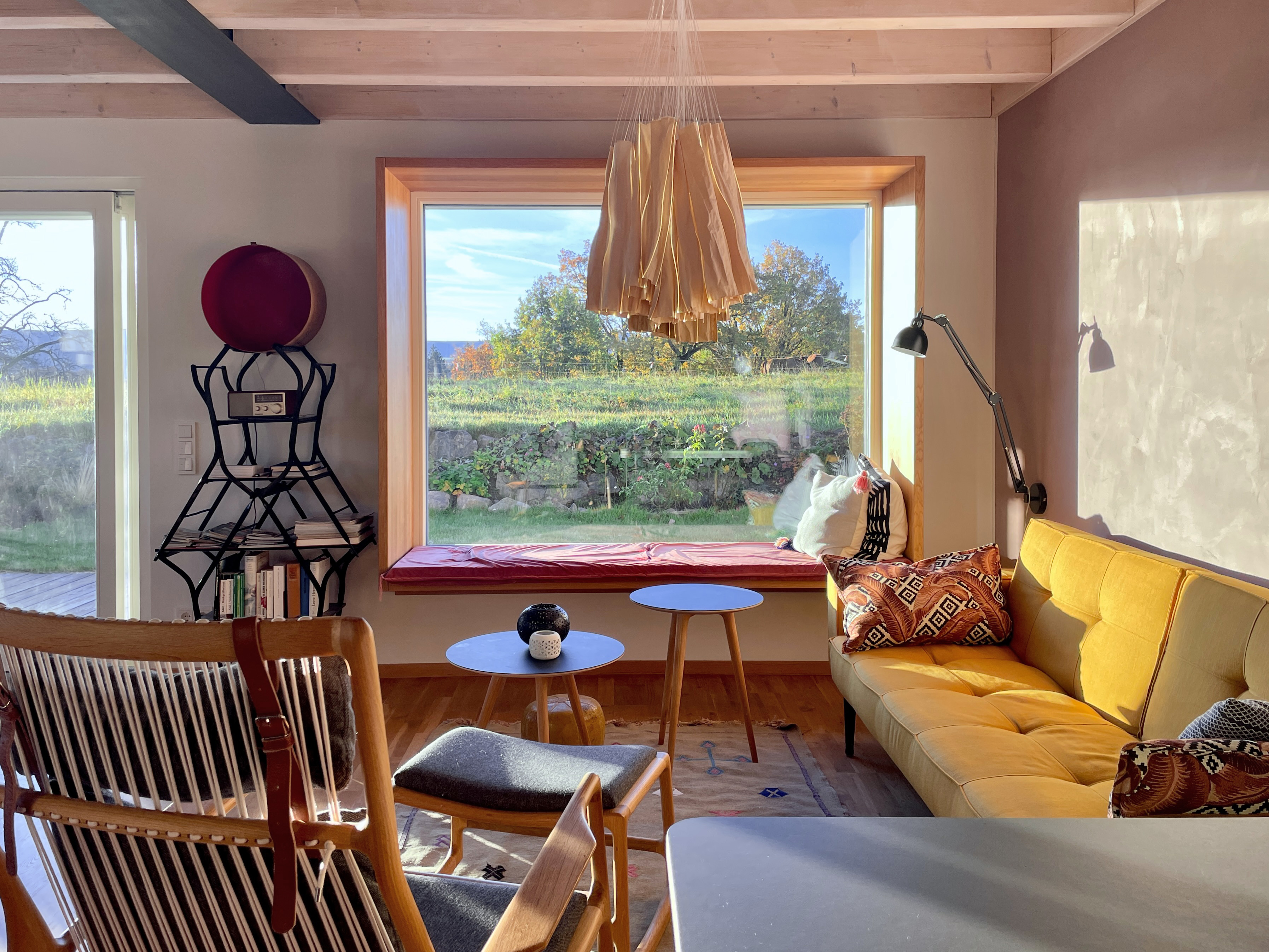 - Wohnzimmer mit Panorama-Sitzfenster (Decken und Kissen), Schlafsofa, kleinem Schreibtisch, Yogamatten (von hejhej)